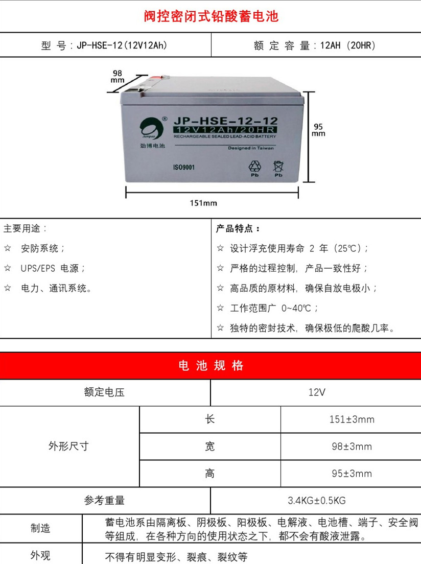产品简介:劲博电池12V12AH - HSE系列电池在整个使用寿命期间无需加水补液,可靠性高、使用寿命长,特殊的密封结构和阻燃外壳,在使用过程中不会产生泄漏电解液的缺陷,更不会发生火灾。